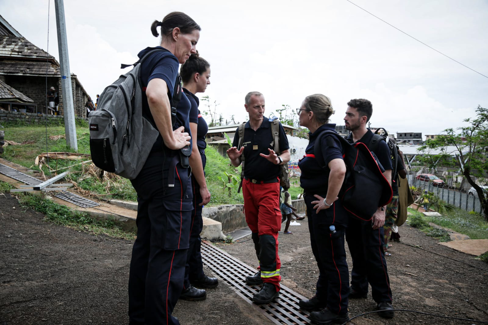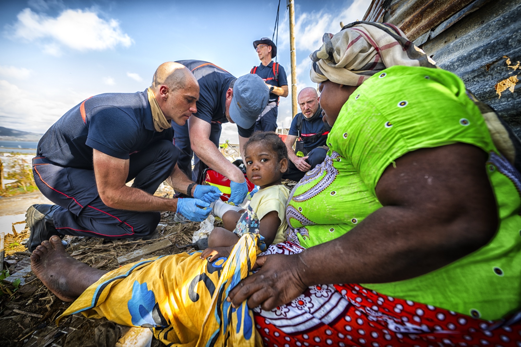 - Reconnaissance et soutien à la population : prise de contact, soins et aide aux habitants touchés par le cyclone.
